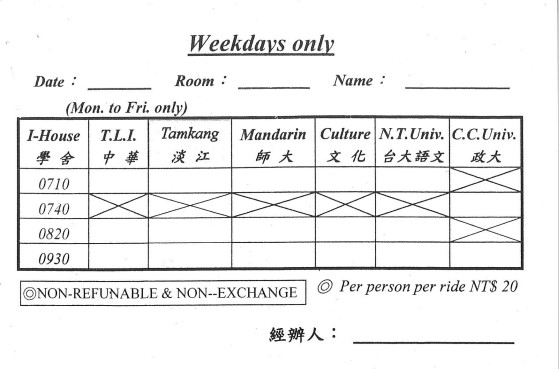 月曜日から金曜日の朝限定で、国際学舍から各学校(中国語センター)までバスのサービスがあります。前日までにフロントで予約します。値段は20元。各学校までバス1本、乗り換えせずに通えるのはありがたいですね!ただし、帰りの便はないので、帰りは地下鉄とバスを乗り継いで帰る必要があります…(主要な学校から1時間以上かかります)。