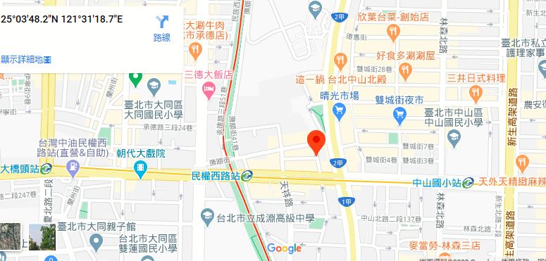 | 住所Adress | 台北市中山區民權西路9巷22號4F(14階建て) |