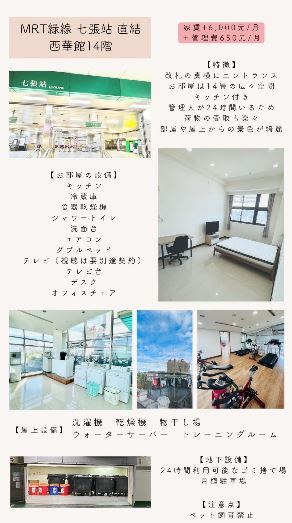 | 含まれないものNot including | 水道光熱費(メーター計算)・インターネット・ケーブルテレビ・管理費(650台湾ドル/月) |