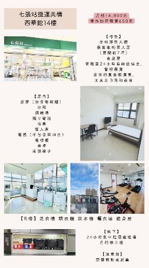 | コメントComments | ・MRT七張駅の駅ビルで、駅直結で便利 ・駅ビルの2階はグルメ街になっており、食事も便利 ・歩いて5分の所に大型スーパーのカルフールがあり大体のものはそろう ・前に遮るものがなく採光、風通し抜群 ・家具は新しく全体的に清潔感あり ・管理人24時間常駐 ・ジムや屋上ラウンジなどの共用スペースあり |