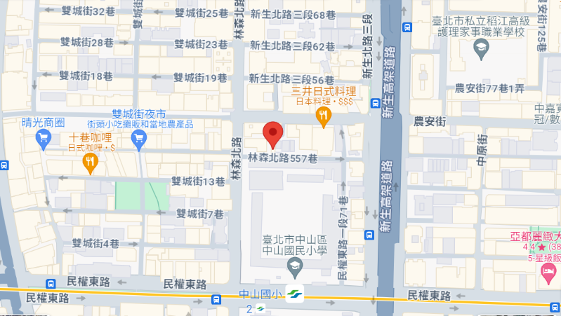 | 住所Adress | 台北市中山區林森北路557巷1號2F(4階建て) |