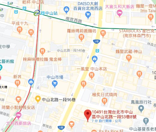 | 住所Adress | 台北市中山區中山北路一段53巷8號9F (12階建て) |