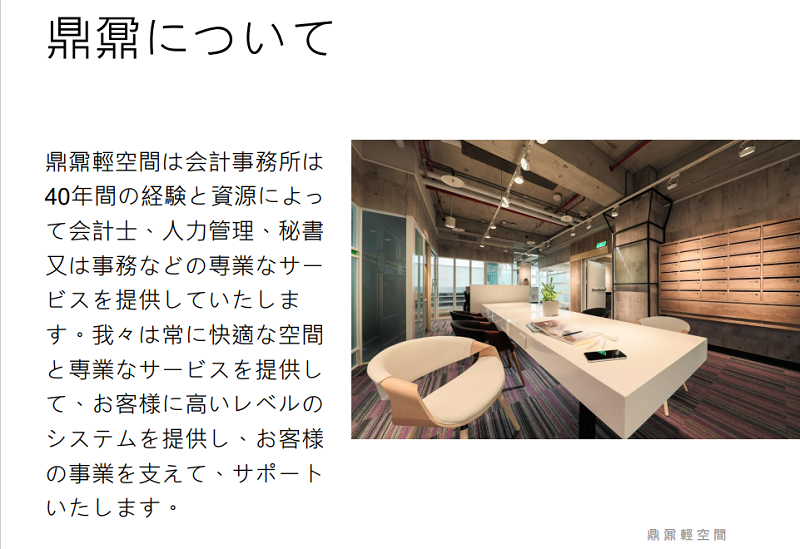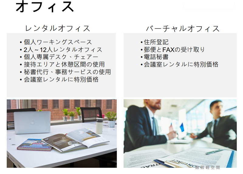 | 家賃Rent | (税抜値段) ・個人用オフィス:8,300台湾ドル~/月 ・4人用オフィス(窓なし):28,000台湾ドル~/月 ・4人用オフィス(窓あり):30,000台湾ドル~/月 ・5人用オフィス:38,000台湾ドル~/月 |