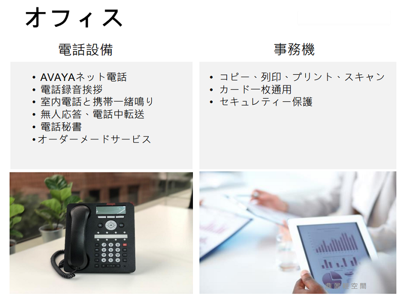 | 含まれないものNot including | 会議室利用料・秘書業務・プリント・FAXなど |