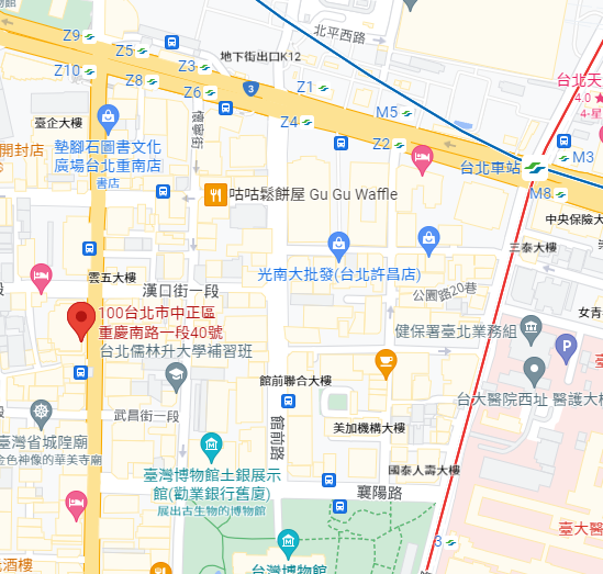 | 住所Adress | 台北市中正區重慶南路一段57號8F(14階建て) |